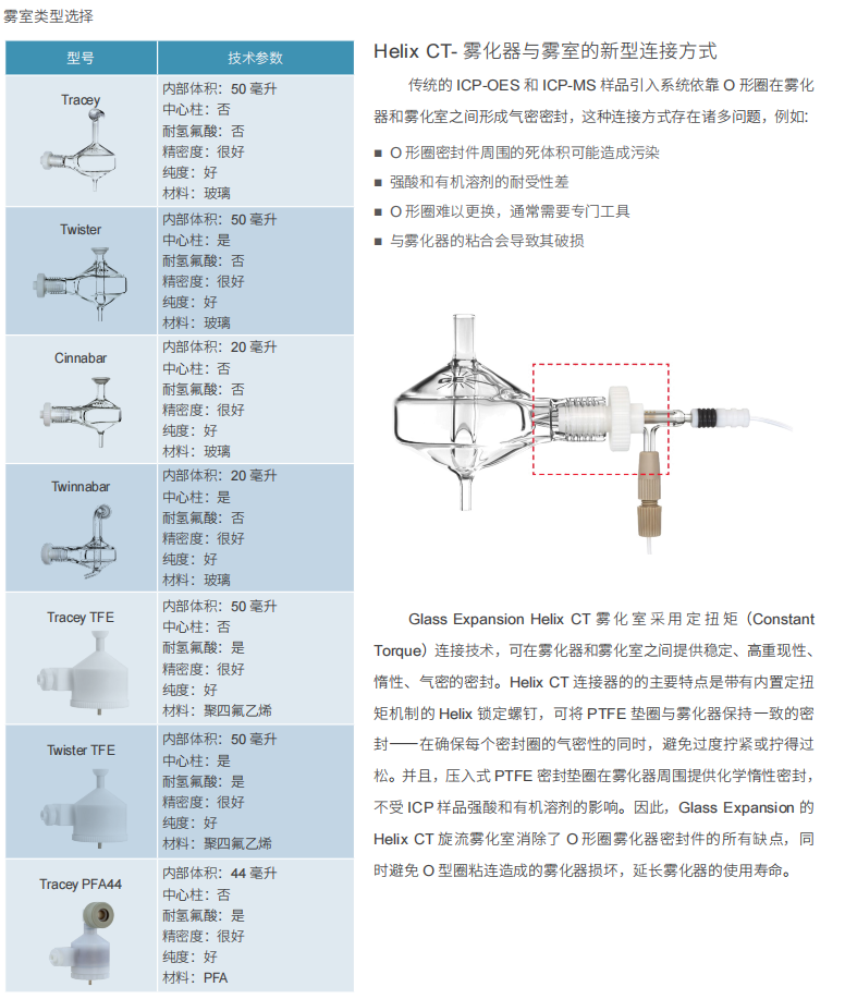 霧室是 ICP 進(jìn)樣系統(tǒng)的另一個(gè)關(guān)鍵組成部分,直接影響了進(jìn)樣系統(tǒng)的霧化效率、精度和洗出時(shí)間。GE 的 Tracey 和Twister 旋流霧化室改進(jìn)了 ICP 霧化室的傳統(tǒng)設(shè)計(jì),提高了霧化效率,降低了洗出時(shí)間。Glass Expansion 獨(dú)特的Helix CT 霧化器連接方式,零死體積,可提高樣品通量。