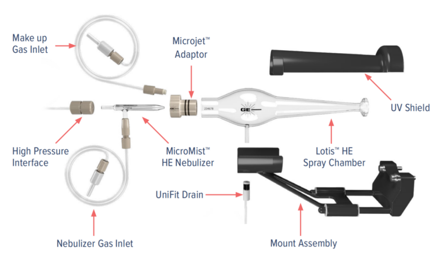 傳統(tǒng)的ICP-MS霧室可從霧化器氣溶膠中過濾出較大的液滴(>5μm)。因此傳輸效率低(通常<5%)。由于大多數(shù)感興趣的細(xì)胞系大于5μm,傳統(tǒng)霧室設(shè)計(jì)的二次過濾機(jī)制阻止了高比例的細(xì)胞進(jìn)入等離子體。為了克服這一缺陷,GE用于單細(xì)胞分析的玻璃霧室的設(shè)計(jì)不同于傳統(tǒng)ICP-MS霧室。