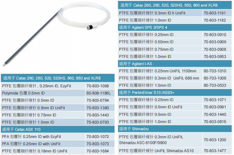 GE碳纖維包覆進樣針可以匹配Cetac 260/280/520/520HS/560/860/XLR8、Agilent SPS 3/SPS 4/I-AS,PerkinElmer S10 /AS93+多種不同型號的自動進樣器,實現(xiàn)精準的進樣效果。