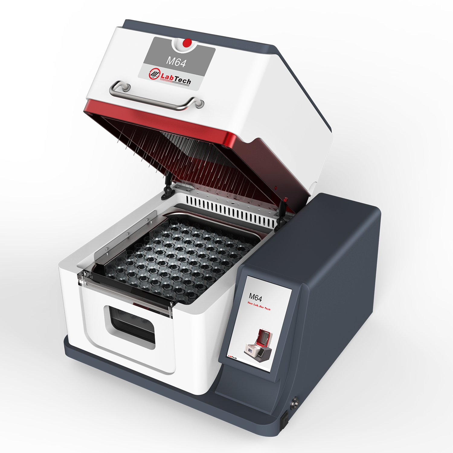 M64 全自動高通量平行濃縮儀,是一款高通量、高效率的快速濃縮儀,利用水浴加熱、氮吹對樣品進行快速濃縮,彩色觸屏電腦控制,最多可支持 64 通道同時使用,令繁瑣的濃縮過程變得簡單。