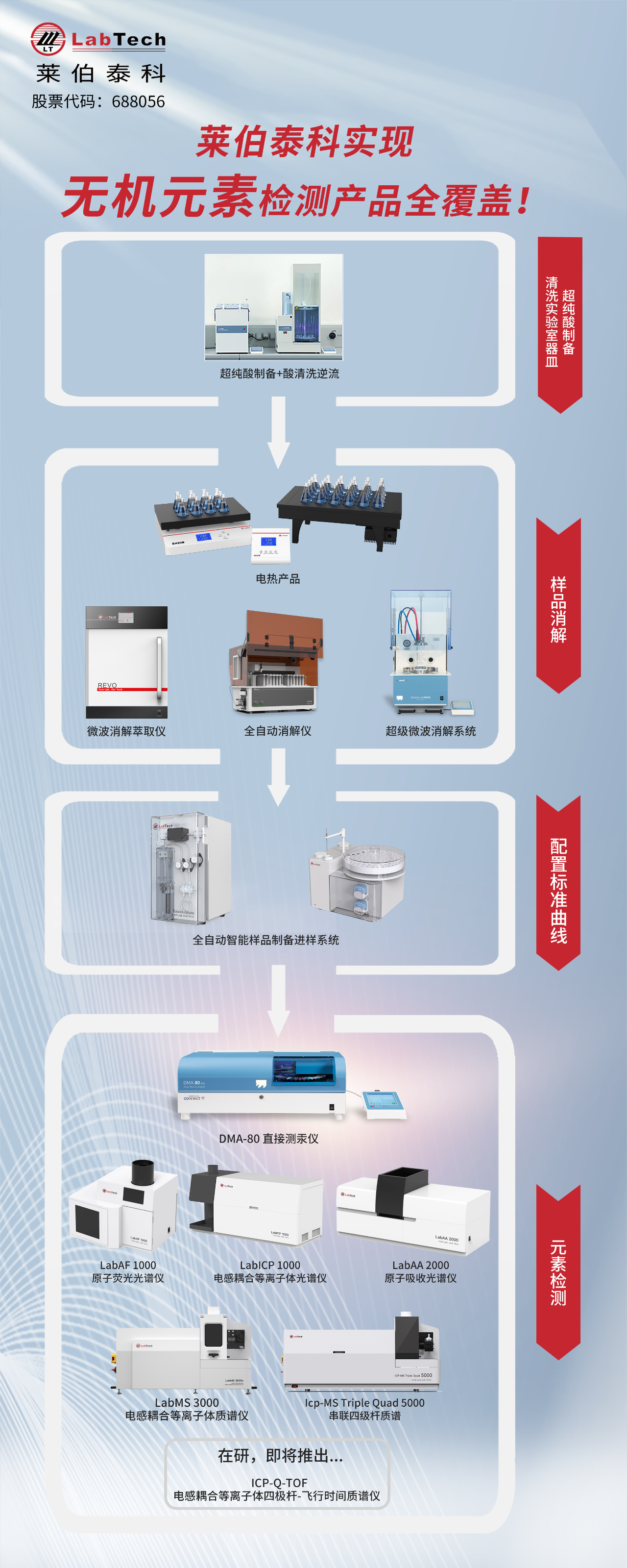 萊伯泰科一直以來致力于技術創(chuàng)新和產(chǎn)品研發(fā),不斷推陳出新、挑戰(zhàn)自我,為用戶提供更加專業(yè)、準確、高效的實驗室分析解決方案。本次三款原子光譜新品的推出,充分展現(xiàn)了萊伯泰科在無機元素分析領域的技術實力和創(chuàng)新能力。新品推出后,萊伯泰科擁有了電熱板-消解儀-微波消解-AA、AF、ICP、ICP-MS、ICP-MS/MS、ICP-Q-TOF,手動-半自動-全自動等元素分析全套產(chǎn)品,可為用戶提供無機元素和同位素分析全鏈條、全面的一攬子解決方案。