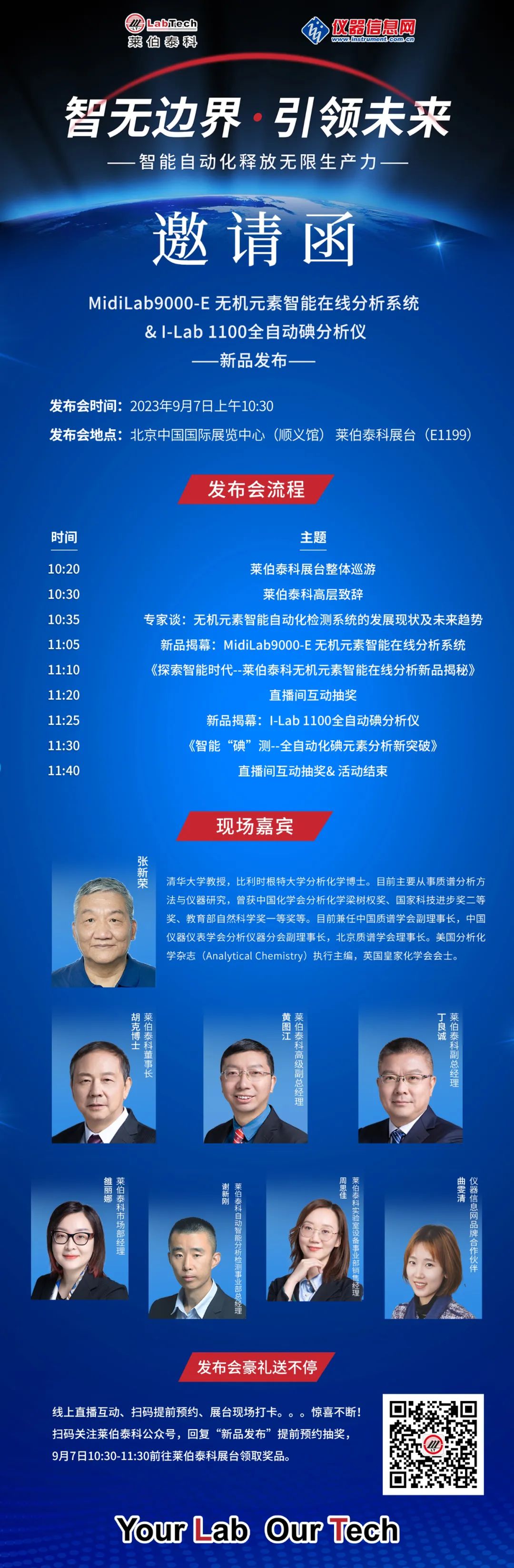 萊伯泰科即將于2023 BCEIA展會期間舉辦“智無邊界 引領(lǐng)未來--智能自動化釋放無限生產(chǎn)力”無機元素智能自動化分析新品發(fā)布會,發(fā)布萊伯泰科的兩款最新產(chǎn)品:MidiLab9000-E無機元素智能在線分析系統(tǒng)和I-Lab 1100全自動碘分析儀。