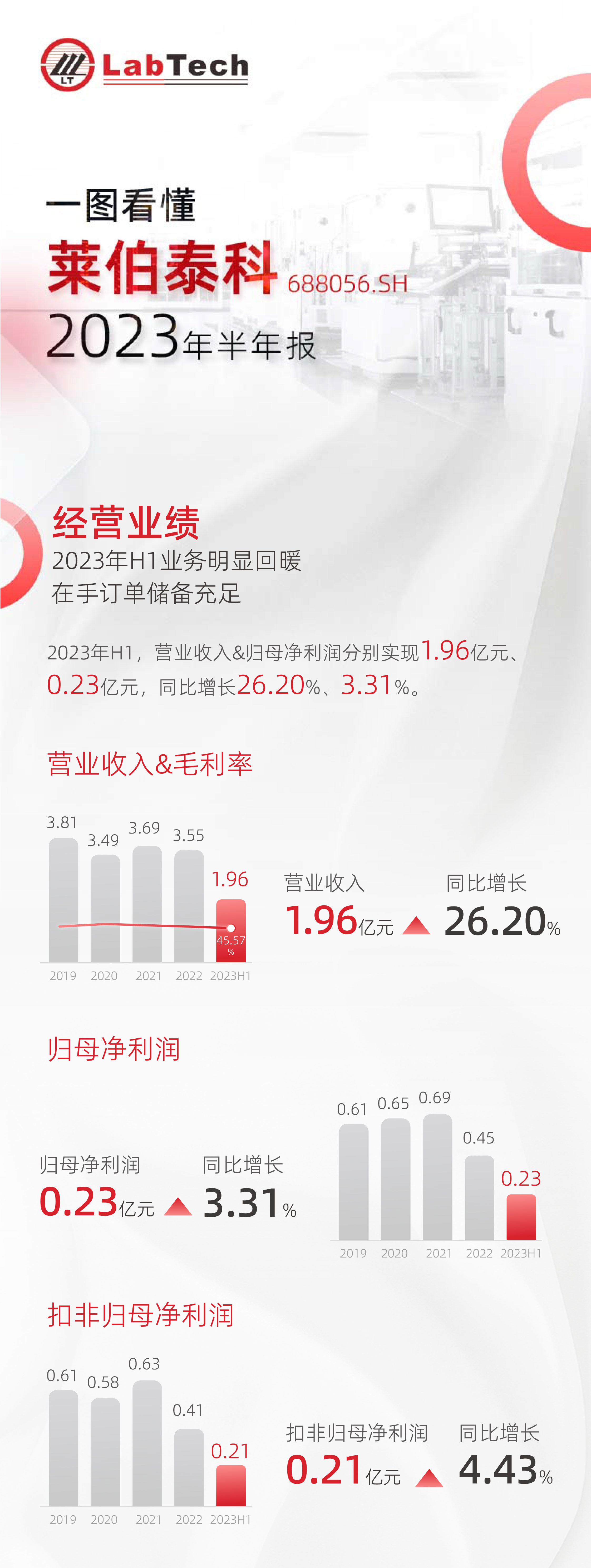 8月29日,萊伯泰科發(fā)布了2023年上半年度報告,業(yè)績喜人。上半年,萊伯泰科實現(xiàn)營業(yè)收入1.96億元,同比增長26.20%;凈利潤0.23億元,增長3.31%。