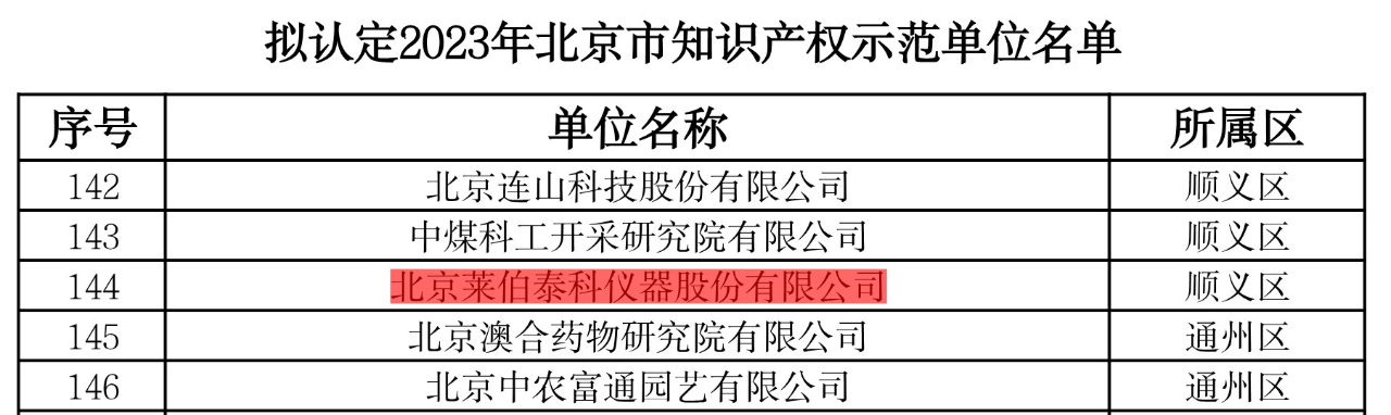 近日,北京市知識產(chǎn)權(quán)局根據(jù)《北京市知識產(chǎn)權(quán)試點示范單位認定與管理辦法》(京知局〔2020〕171號)組織開展了2023年北京市知識產(chǎn)權(quán)試點示范單位申報評審工作及2020年度北京市知識產(chǎn)權(quán)試點示范單位復(fù)審工作。經(jīng)初審、形式審核和專家評審,北京萊伯泰科儀器股份有限公司(以下簡稱“萊伯泰科”)被認定為2023年“北京市知識產(chǎn)權(quán)示范單位”。