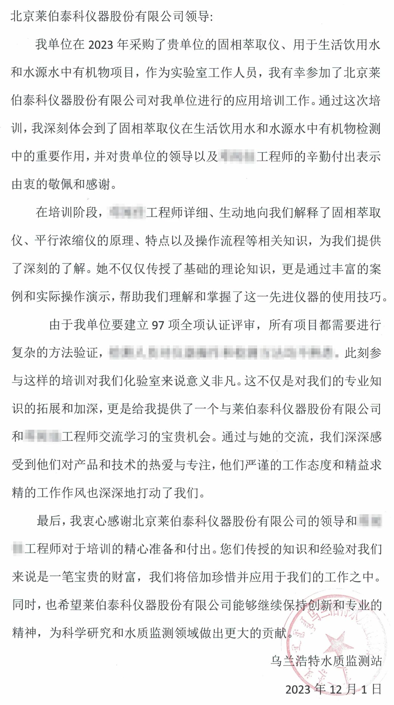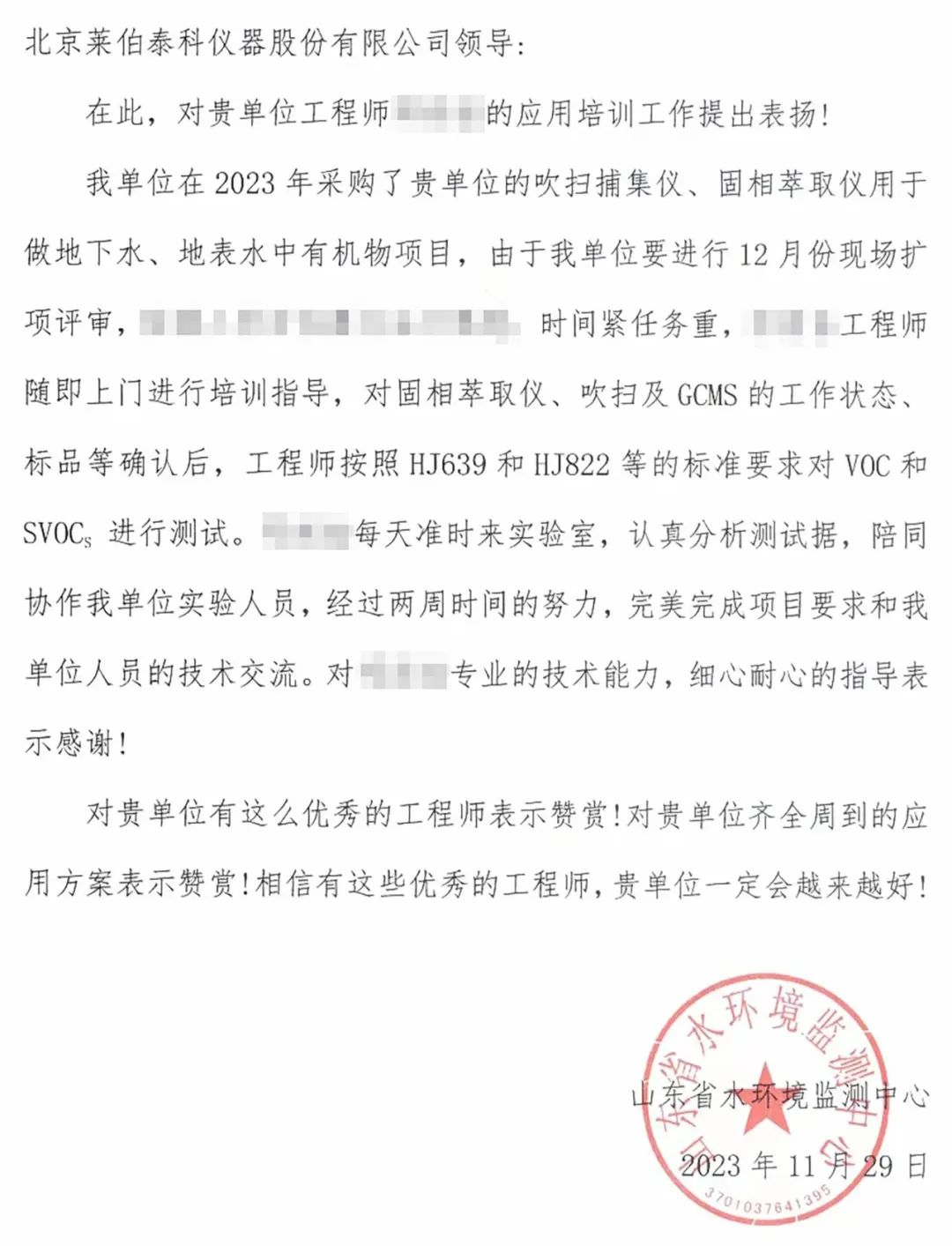 近日,北京萊伯泰科儀器股份有限公司(以下簡稱“萊伯泰科”)陸續(xù)收到來自山東省水環(huán)境監(jiān)測中心及內(nèi)蒙烏蘭浩特水質(zhì)監(jiān)測站的兩封感謝信。這兩封信件充分肯定了萊伯泰科工程師在項目支持中所表現(xiàn)出的專業(yè)技術(shù)能力和出色的服務(wù)精神,并對萊伯泰科提供的整體解決方案給予了高度評價。這一客戶的認(rèn)可再次體現(xiàn)了萊伯泰科一貫秉承的“客戶至上”服務(wù)理念,也再次凸顯了公司在軟實力及客戶服務(wù)方面的卓越表現(xiàn)。