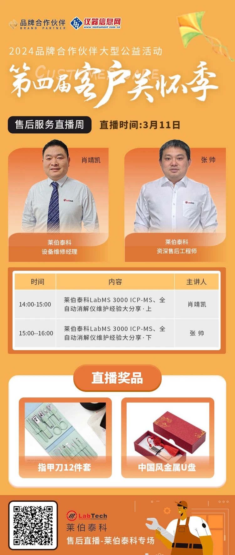 儀器信息網(wǎng)“第四屆客戶關懷季”萊伯泰科售后直播專場將于2024年3月11日14:00開啟,萊伯泰科設備維修經理肖靖凱、萊伯泰科資深售后工程師張帥將為廣大用戶帶來《萊伯泰科LabMS 3000 ICP-MS、全自動消解儀維護經驗大分享》。