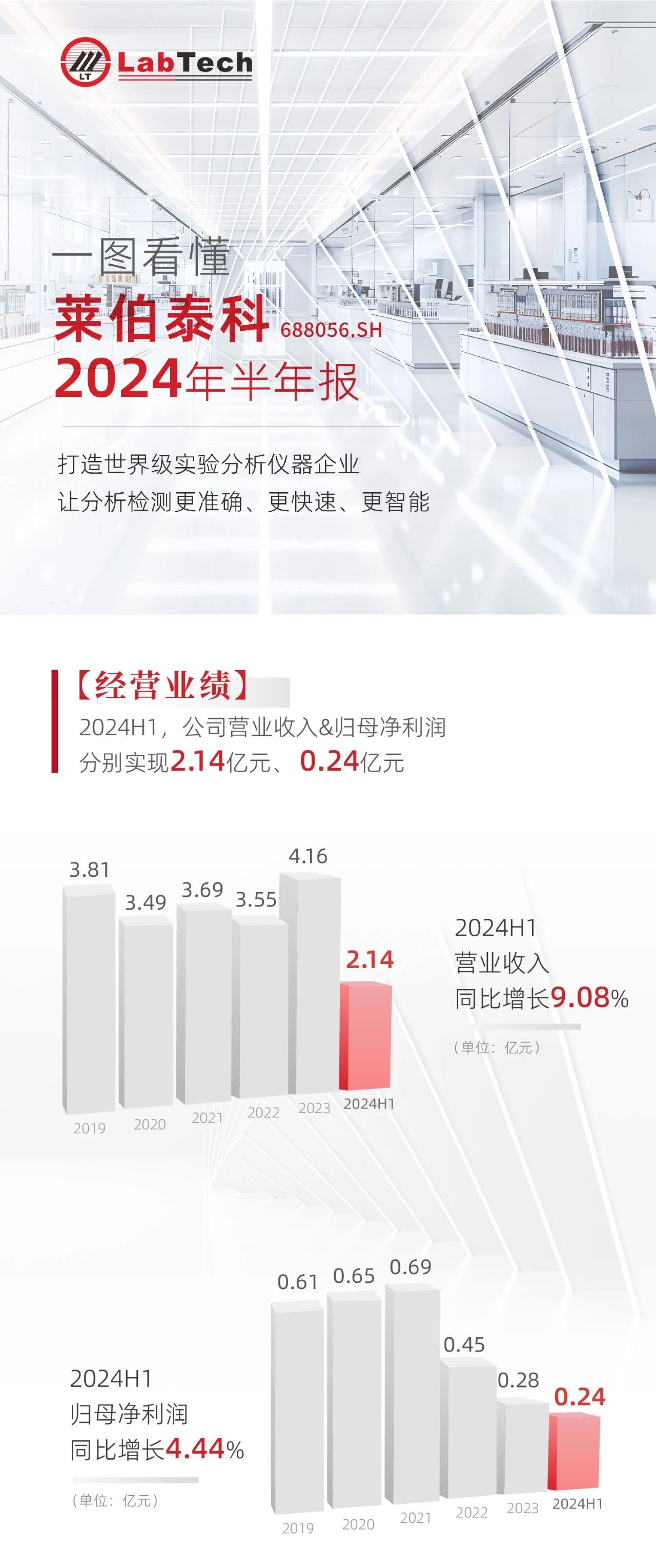 8月28日,萊伯泰科揭曉了2024年中報(bào)。在2024上半年,萊伯泰科表現(xiàn)出整體穩(wěn)健的增長(zhǎng)勢(shì)頭,營(yíng)業(yè)收入2.14億元,同比增長(zhǎng)9.08%,歸母凈利潤(rùn)0.24億元,同比增長(zhǎng)4.44%,實(shí)現(xiàn)了營(yíng)收和凈利的雙增長(zhǎng)。