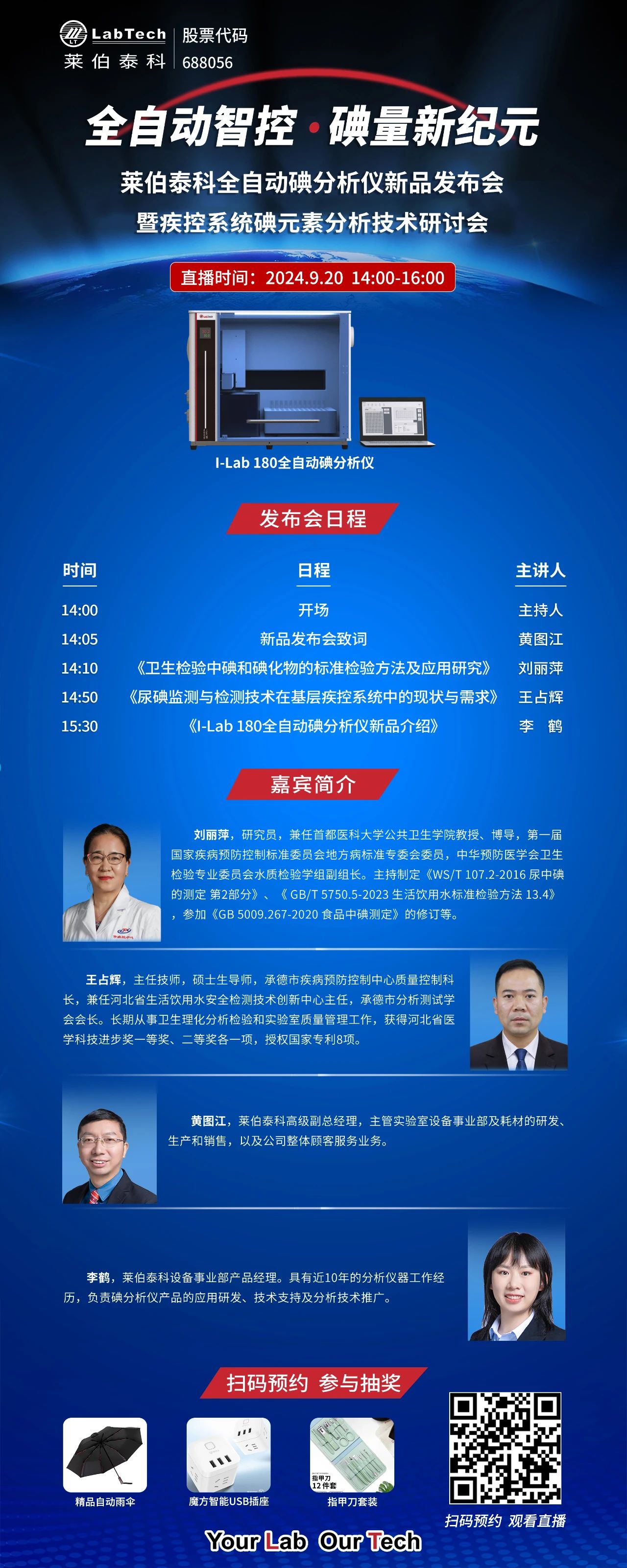 我們誠邀各界人士屆時通過網(wǎng)絡(luò)直播平臺觀看這場線上發(fā)布會,共同見證萊伯泰科全自動碘分析儀新品I-Lab 180的誕生,開啟碘量監(jiān)測的新紀元!