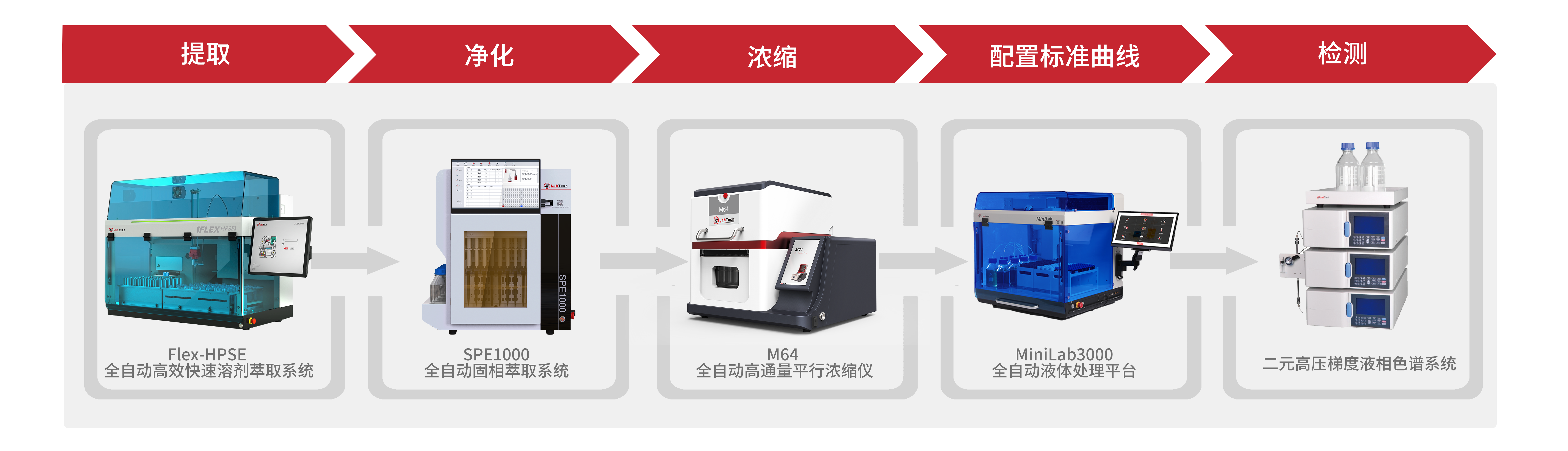 本方案參考《HJ 956-2018環(huán)境空氣 苯并[α]芘的測定 高效液相色譜法》,使用Flex-HPSE全自動(dòng)高效快速溶劑萃取系統(tǒng)提取、SPE1000全自動(dòng)固相萃取系統(tǒng)凈化、M64高通量平行濃縮儀濃縮、二元高壓梯度液相色譜系統(tǒng)檢測,建立了一種環(huán)境空氣中苯并[α]芘含量檢測的分析方法。該方案可以實(shí)現(xiàn)自動(dòng)化、高通量的提取、凈化和濃縮,有效避免和減少有機(jī)試劑對(duì)分析人員造成的健康危害,減少人員用量、減少人為誤差。