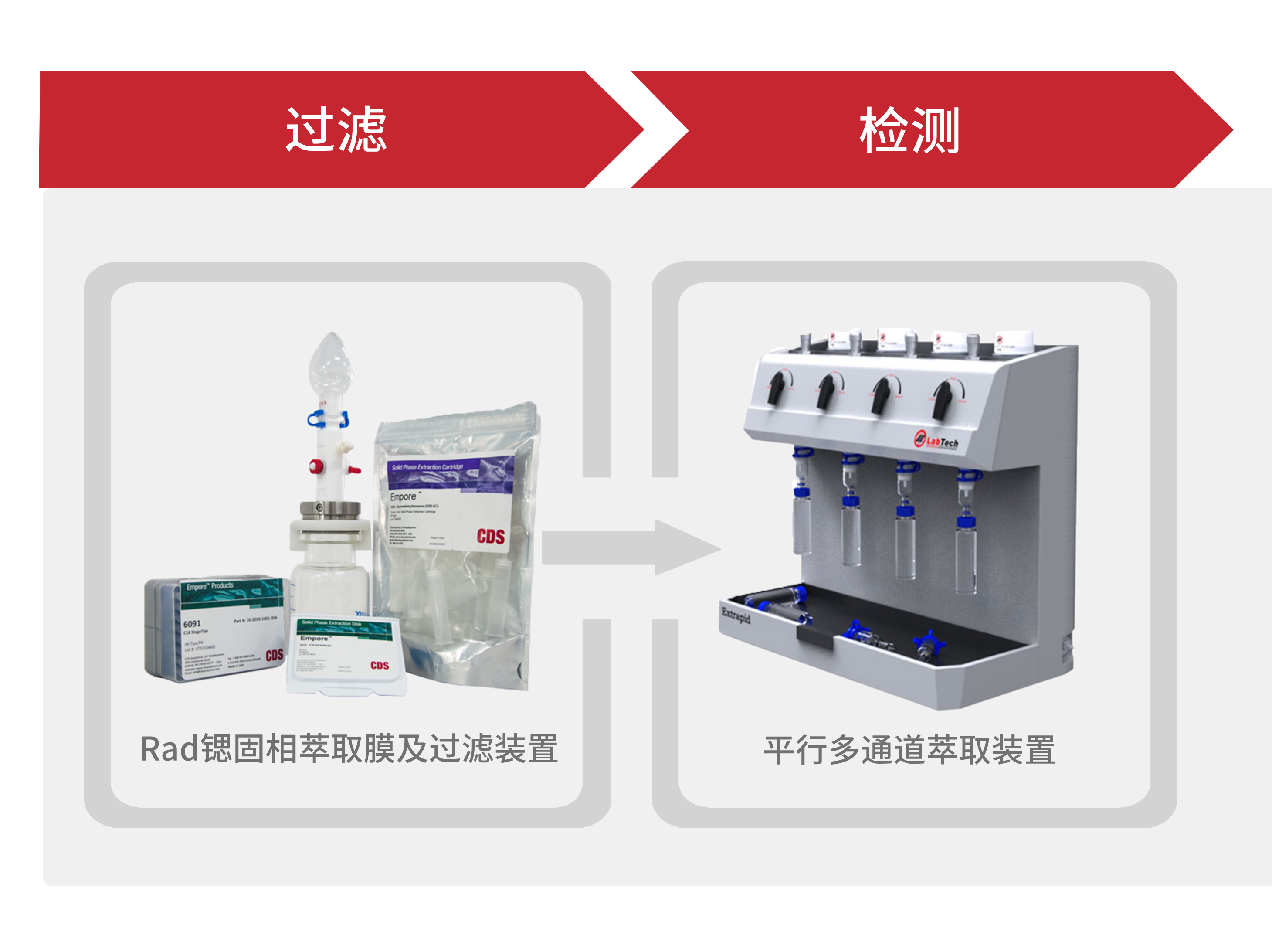 該方案使用了平行多通道萃取裝置、Rad鍶固相萃取膜、手動(dòng)過(guò)濾裝置根據(jù)各戶需要提供各種不同的方案,該產(chǎn)品由我公司自主研發(fā)設(shè)計(jì)。提高了樣品通量,降低了人工與耗材的成本,結(jié)合ICP-MS等后續(xù)分析儀器檢測(cè),實(shí)現(xiàn)鍶快速制樣、檢測(cè),為核素研究提供了便利。